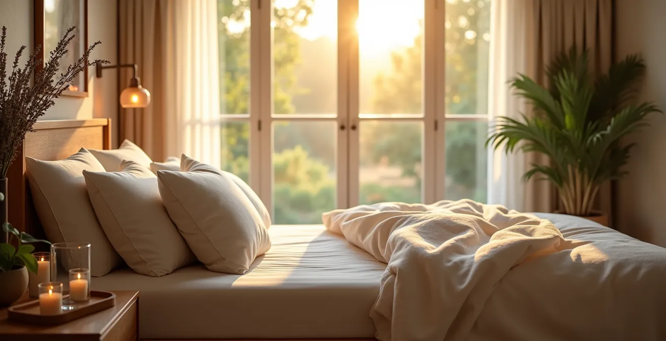 Parallèlement, concentrez-vous sur la création d’un environnement sensoriel optimal. La température de la chambre doit être fraîche (autour de 18°C), l’obscurité totale (utilisez des rideaux occultants et un masque de sommeil si besoin) et le silence le plus complet possible (bouchons d’oreilles, bruit blanc). Pensez aussi à l’olfactif : quelques gouttes d’huile essentielle de lavande ou de petit-grain bigarade sur l’oreiller peuvent aider à calmer le système nerveux.